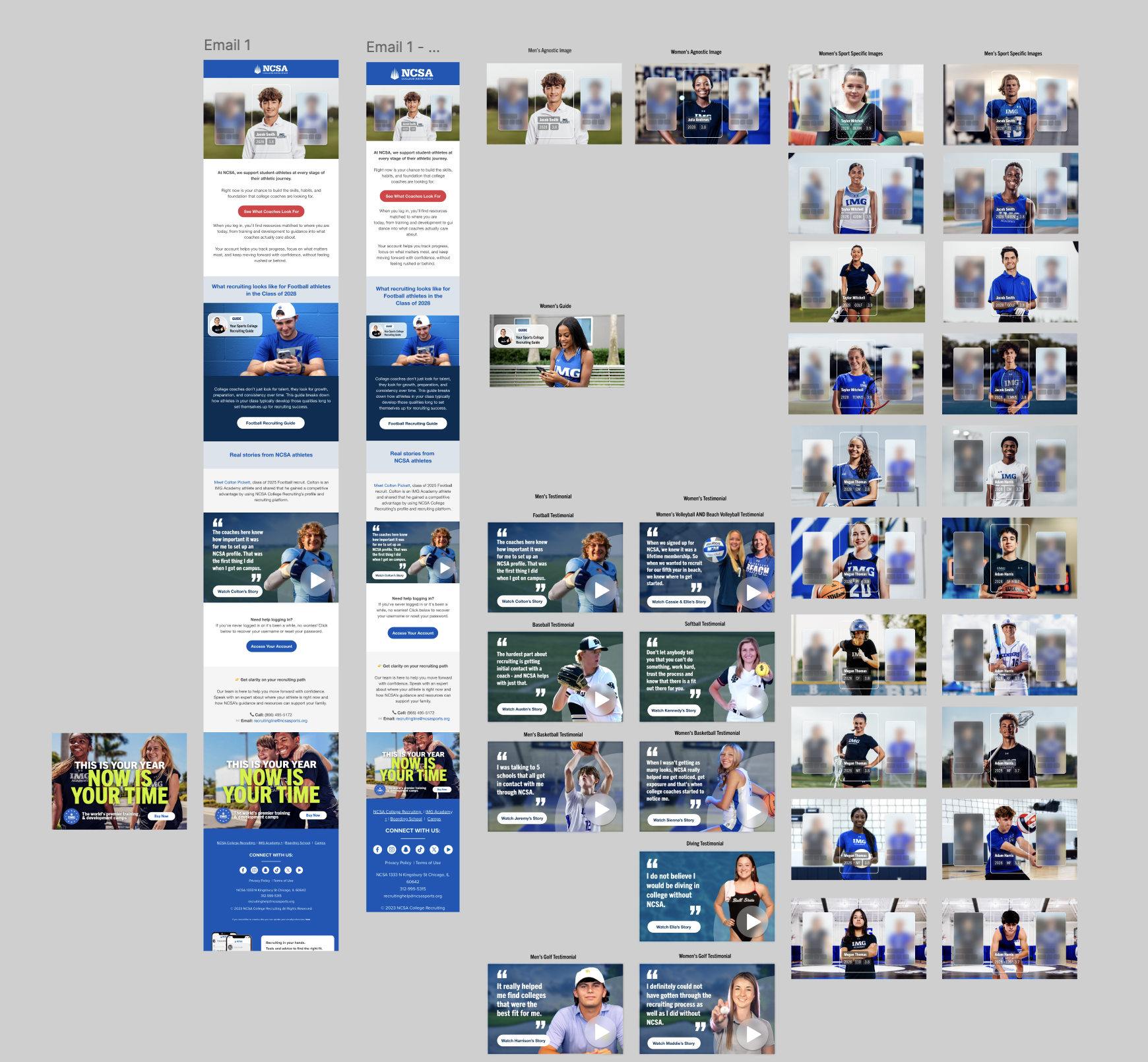 This image is a screenshot of the first email in my Figma file that lays out a desktop and mobile version of the email and then the top hero images for each sport and the body images in gender specific designs and testimonials. It was important that each athlete could see themselves using our product, so it was a goal of mine to make sure the images were also diverse.